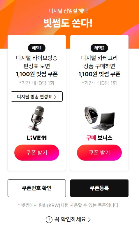 디지털 카테고리의 아무거나 구매를 한 다음에 다시 1,100원짜리 쿠폰이 지급됩니다.
