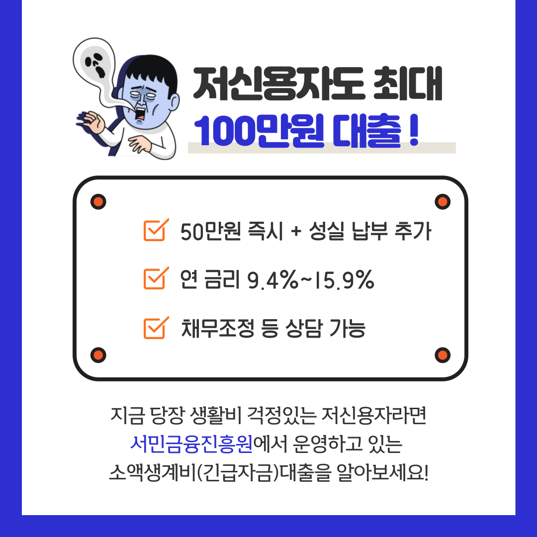 부디 이번 제도를 통해 올바른 금융 습관을 기르시고 저신용자를 탈피하면서 긴급하게 생활비를 확보하는 방향으로 제도를 활용하시길 바랍니다.